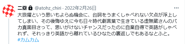 ・ひなたのラジオ英語講座の挫折以来しばらく姿を隠していた英語を、こうして久々に『カムカム』作中に登場させたのが、謎の振付師ことサンタ黒須こと算太であることに、皮肉を見ればいいのか、それともほろ苦さを噛みしめるべきか。