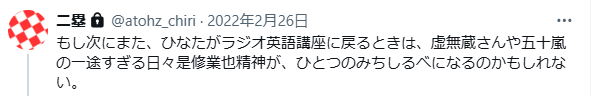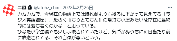 本放送のこの頃、ラジオ英語講座というテーマが直接姿を見せなくても特に気にならなかったのは、『妖術七変化』とモモケン周りの物語はもちろん、五十嵐という若者に示す るいジョー夫婦の愛情や、虚無さんの「日々鍛錬を忘れぬ」精神など、安子編るい編と地続きの時間がしっかり感じられたからなんですよね。