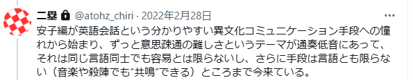 画面を止めて見ると、大好きな時代劇村の醍醐味をいかに伝えるか、相当に考えて書いている。新人時点からこれだけの長文を書けるなら、本当にあとは英語という手段を得るだけだったんだなあ、ひなた。言語学習でよく言われる、語学力そのものよりも何を伝えたいかの材料を持っていることが大事、というのがちゃんと現れている。