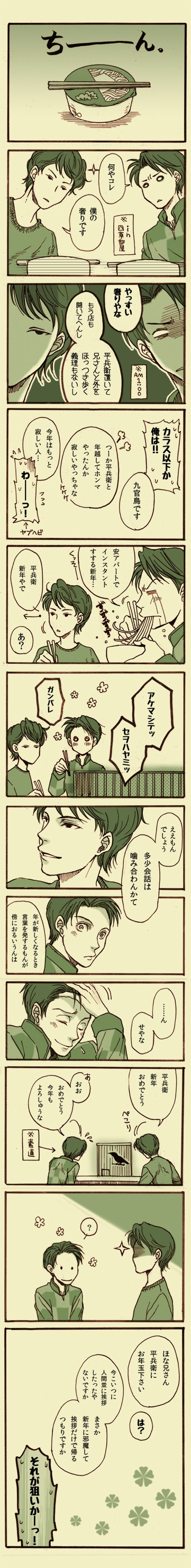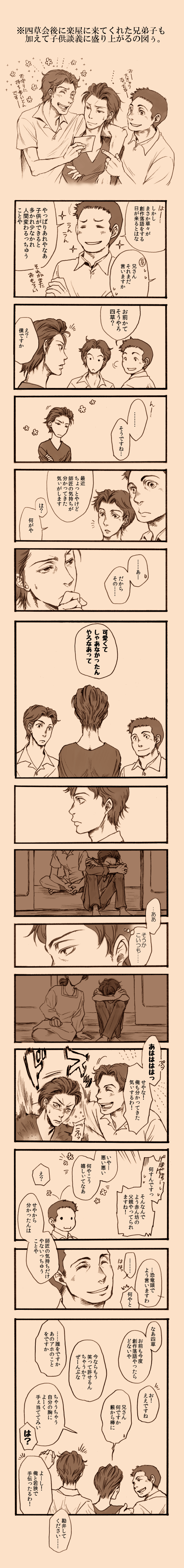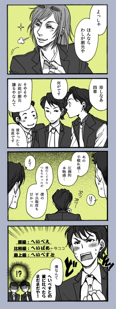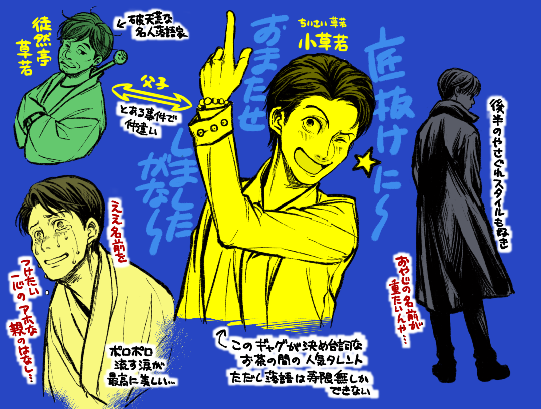 『PLANETE』のもぴさん虎さん対談で、小草若はあの後きっとA子に結局ふられるだの、また四草ん家に転がり込むだの、言いたい放題話されてたのがおかしかったので、描いたマンガ。