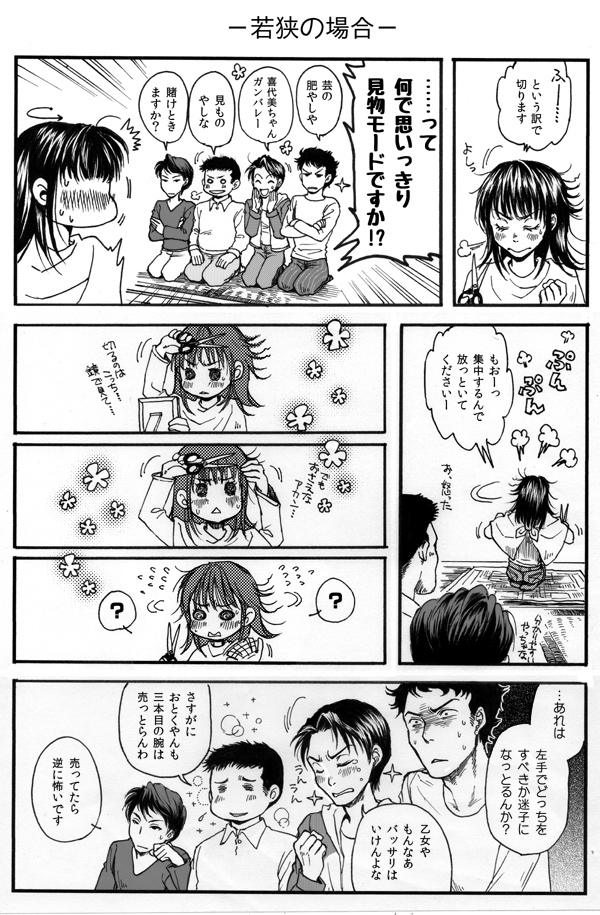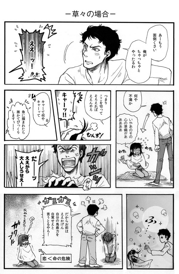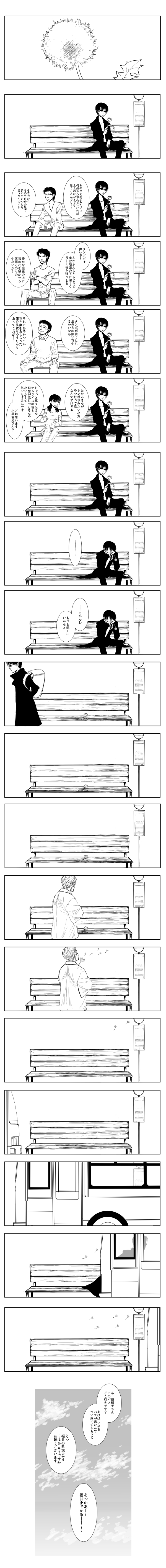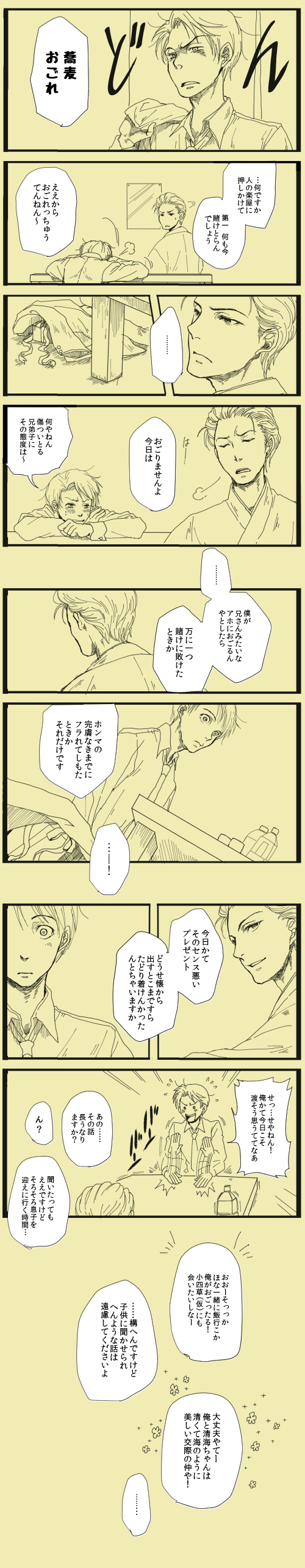 『PLANETE』のもぴさん虎さん対談で、小草若はあの後きっとA子に結局ふられるだの、また四草ん家に転がり込むだの、言いたい放題話されてたのがおかしかったので、描いたマンガ。