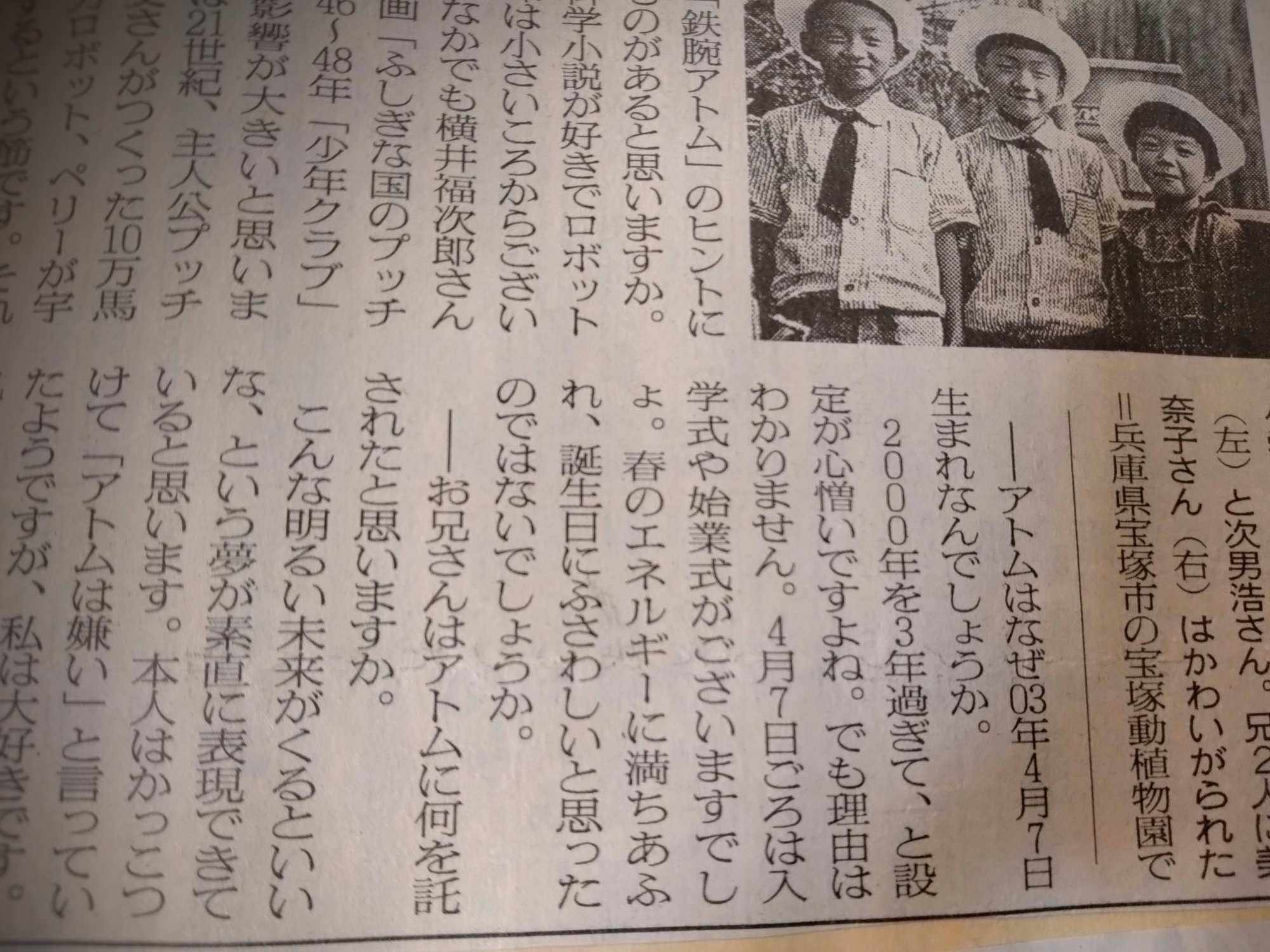新聞を中心にTVやアニメ雑誌、当時の小遣い許す限り集めてた記事を読み返しましたが、やはり連載開始日由来という言及はなし。あくまでも、原作中で手塚先生が設定した日だからという前提で、それでいてリアルタイムにやってくる「2003年4月7日」への祝賀ムードが、今読み返してもすばらしく熱い。わあ、懐かしくて涙出てくるな。