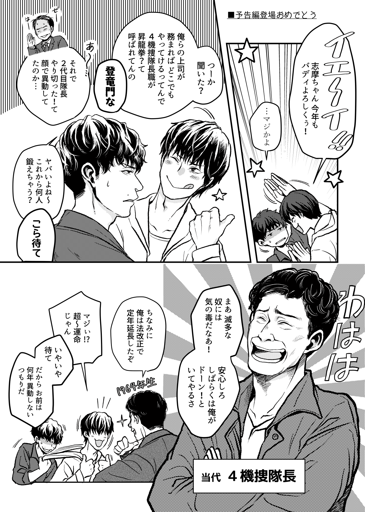 地方公務員法改正による定年延長で陣馬さんが24年以降もしばらく現役なのは確定ですが、機捜隊長職にも役職定年制がかかるのかがいまいち分からない。とはいえ、4機捜自体が(そもそも架空で)イレギュラーな存在だし、始まりからして桔梗さんが隊長職を兼任していたので、案外しれっと陣馬さんが隊長職を任され続けててもいいかもしれない。